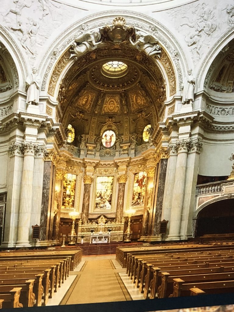 Але мене особливо вразило приміщення Берлінського кафедрального собору. Як ззовні, так і всередині кафедральний собор вражає своєю красотою і вишуканістю. Там знаходиться дуже старинний орган і гробниця з саркофагом членів династії Гогенцоллернів.